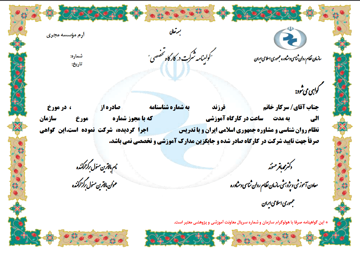 | 9 | کارگاه دوم: درمان سوء رفتار با همسر (ابیوس زناشویی) (مدرک سازمان نظام روانشناسی کشور) | 8 | دکتر کیومرث فرحبخش |